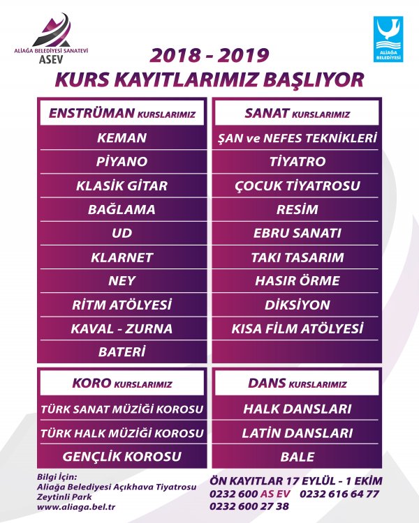 Deneyimli ve güçlü kadrosuyla 7’den 70’e her yıl binlerce Aliağalıya sanat alanında eğitimler veren ASEV, hazırladığı geniş kapsamlı kurs programı ile kentin sanat hayatına bu yıl da renk katacak. 2018-2019 dönemi kurslarına katılmak isteyen vatandaşlar 17 Eylül-1 Ekim 2018 tarihlerinde Aliağa Açıkhava Tiyatrosu’na şahsen başvurarak ön kayıt yaptırabilecek.