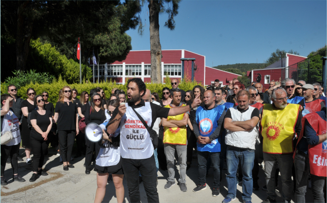 Öğretmenimizin dönem ortasında işten çıkarılmasının asıl sebebinin rapor olmadığının hepimiz farkındayız. Asıl sebep öğretmenimizin 1928 yılında Atamızın direktifleriyle kurulmuş Türk Eğitim Derneğine ve öğretmenliğe yakışır şekilde bu sömürü düzenine sendikasıyla birlikte karşı çıkmasıdır. Asıl sebep diğer 24 öğretmenin gözünü korkutmak için öğretmen arkadaşımızın işten çıkarılmasıdır. Asıl sebep öğretmenimizin sendikalı olmasıdır." dedi.