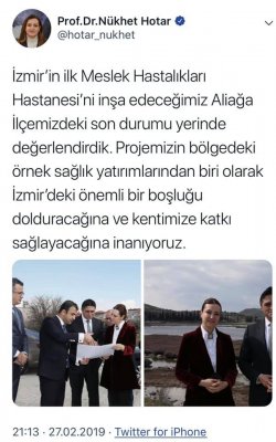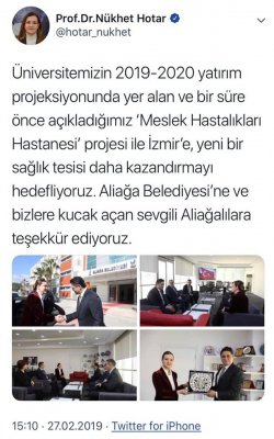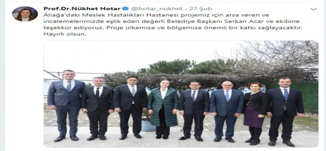Rektör Nükhet Hotar, sosyal medya hesabı Twitter üzerinden yayınladığı mesajlarda şu ifadeleri kullandı: “Aliağa’daki meslek hastalıkları hastanesi projemiz için arsa veren ve incelemelerimizde eşlik eden değerli Belediye Başkanı Serkan Acar ve ekibine teşekkür ediyoruz. Proje ülkemize ve bölgemize önemli bir katkı sağlayacaktır. Hayırlı olsun”