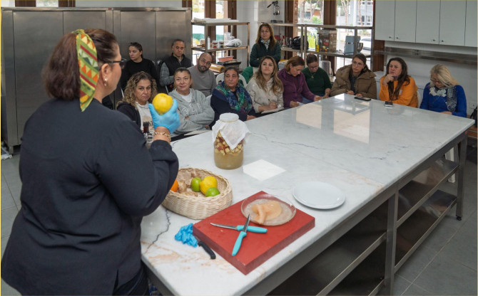 Sevilay Feyizoğlu, “Kooperatiflerimiz için üç-dört çeşit yapıyorum. Bireysel olarak da 60’ın üzerinde sirke çeşidim var. Isparta gülü, Meksika biberi, kekik, biberiye, ıhlamur, ada çayı, ananas gibi sirke çeşitleri örnek olarak sayılabilir. Ben sirkenin çok faydasını gördüm. Hiçbir yerde sirke yapımı konusunda eğitim verilmediği için kendim araştırarak öğrendim. Daha sonra çevrimiçi eğitimlere katıldım. Deneyerek öğrendim. Turuncu Eller Tarımsal Kalkınma Kooperatifi’ne Cemil Tugay başkanımız gelmişti. Ona sirke yapımından bahsedince böyle bir atölye düzenlemeyi teklif etti. Böylelikle atölyemizi düzenledik. Bugün eğitime, yapımı en kolay sirke olan elmadan başladık. Hangi ürünlerle sirke yapılabileceğini ve sirkenin faydalarını anlattım” dedi.